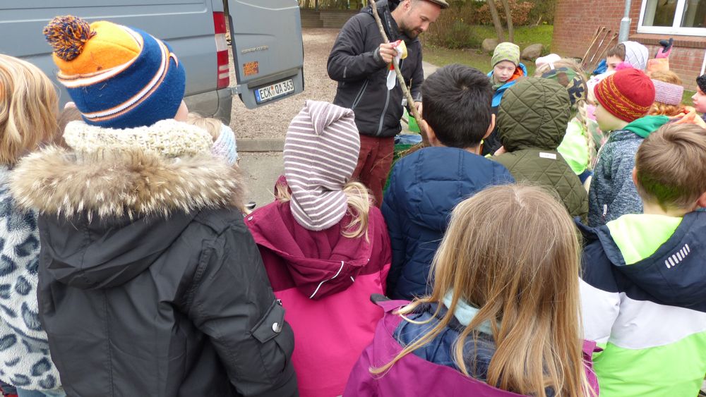 Alle buddelten kräftig und schleppten Wassereimer. Haben wir viele Regenwürmer ausgegraben. Die tun auch gar nichts. Man kann sie einfach auf die Hand nehmen. Danach müssen sie aber wieder in die Erde zurück. Die Bäume sind gepflanzt und müssen nun regelmäßig von uns gegossen werden.